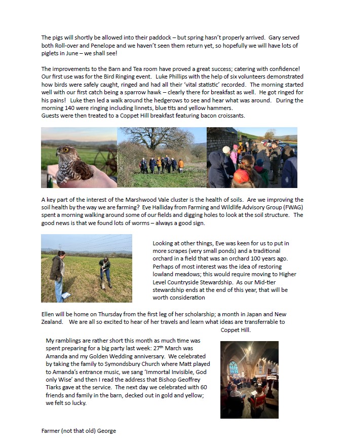 Good morning Thanks for all staying in touch – hopefully you do find some of this information useful, and of course, that you enjoy Farmer George’s Diary. It is available on www.coppethill.co.uk as well. Let me know if there is anyone you think of who might like this sent direct. Sunday 8th February – St John the Baptist, Symondsbury at 9.30 a.m. Celtic Worship Sunday 8th February – Loders Village Hall 7.00 p.m. ECV Quiz Evening with Bar and Refreshments. This follows on from the Broadoak ECV Quiz last month, which was full to capacity. Please call the Lacks on 01308 485441 if you would like to come. Monday 9th February – Broadoak Village Hall 3.00 – 5.00 p.m. Tea and Chat. Please call Georgina on 07855 801637 for more details. Thursday 12th February - Symondsbury School at 7.00 p.m. Symondsbury Parish Council meeting. Sunday 15th February – St Paul’s Broadoak at 6.30 p.m. Evening Prayer Friday 20th February – Coppet Hill at 2.00 p.m. Nest Box Building event. Sunday 22nd February – St John the Baptist, Symondsbury at 11.00 a.m. – United Benefice Eucharist service Saturday 28th February – Coppet Hill at 7.30 A.M. Nature Photography Walk and Workshop (weather permitting) All the best Amanda and George ( Saturday 14th March – Coppet Hill Bird ringing session and breakfast – contact me for more details )